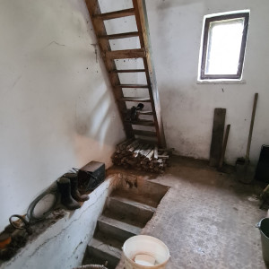 • špajza so schodiskom do suterénu a dreveným rebríkom na povalu